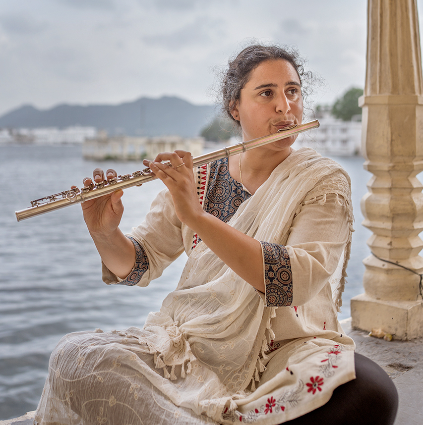 The flutist, vocalist and composer spent several months traveling alone around India in search of the spirit of Hindustani music. Nourished by her encounters and learning, she has created an intimate, spiritual repertoire rooted in her tangible sensations. The composition reflects both the contemporary aesthetic and the strong link with the language of Indian classical music. She brings together the talented Indian classical musicians Samrat Pandit on Vocals, Sougata Roy Chowdhury on Sarod and Subhajyoti Guha on Tabla.